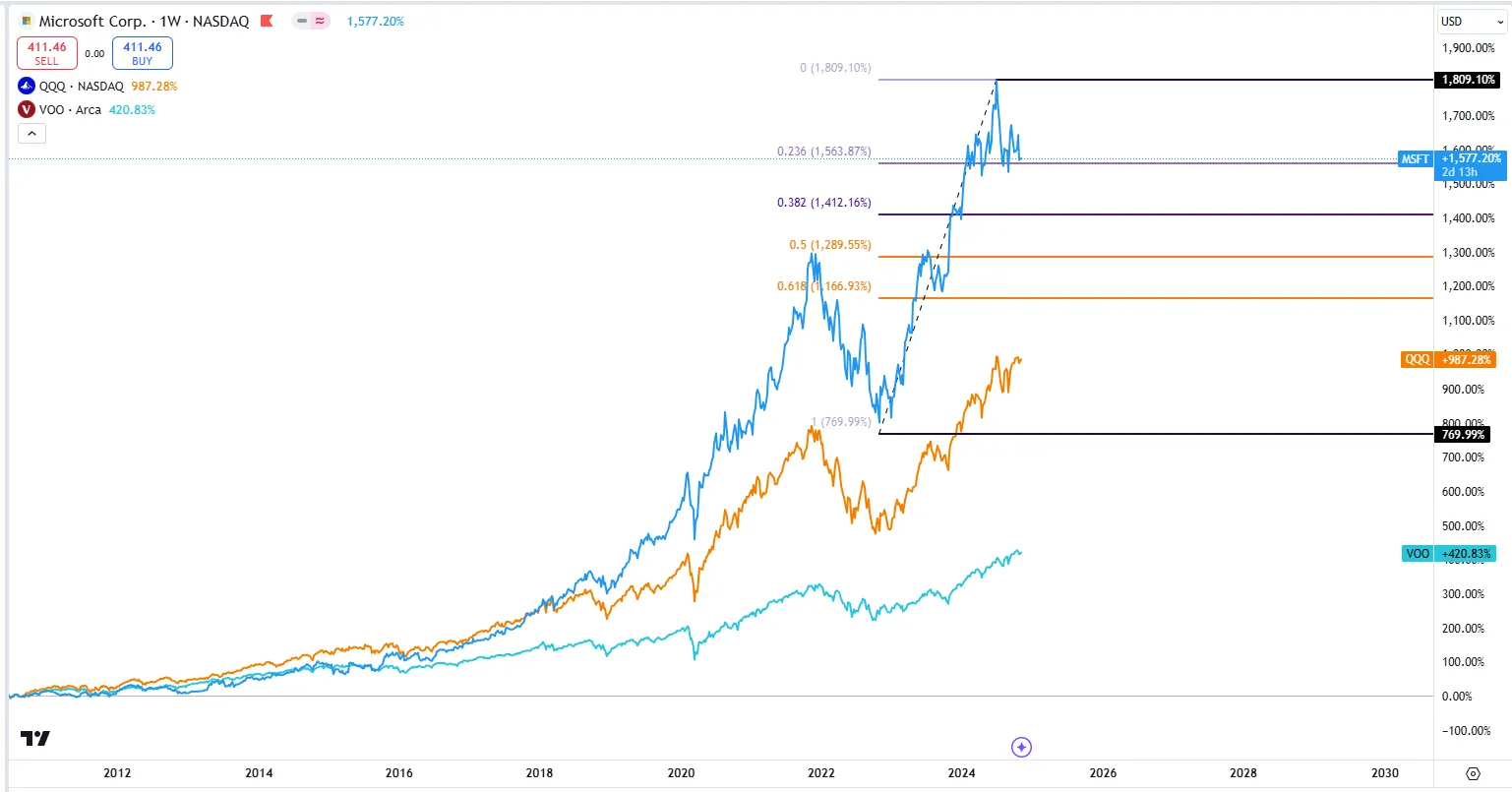 $MSFT 可以说是跑赢VOO和QQQ最简单的Bet,假如你近10几年来投资了微软,你轻轻松松跑赢大盘。