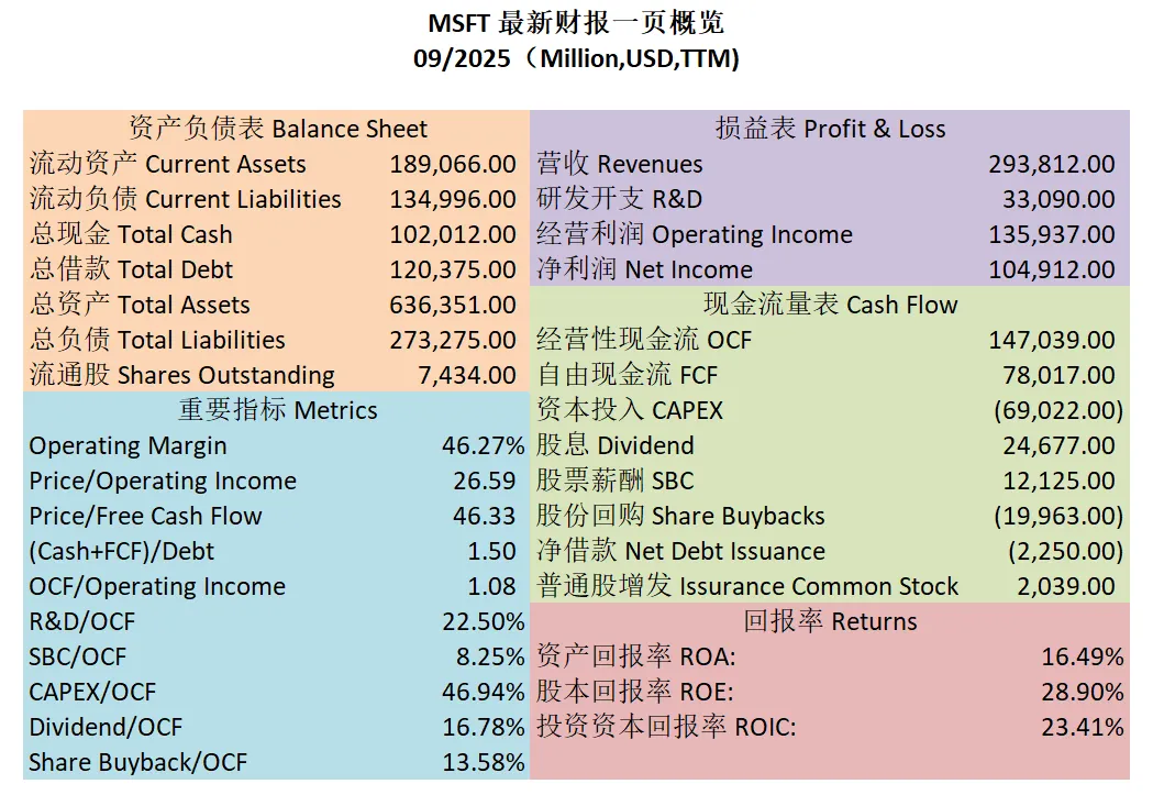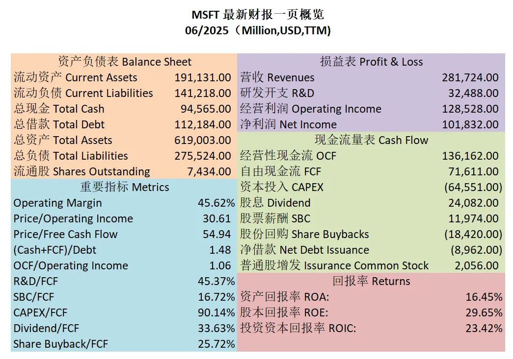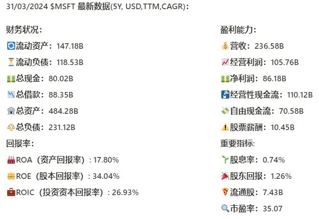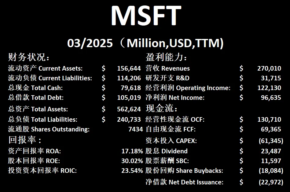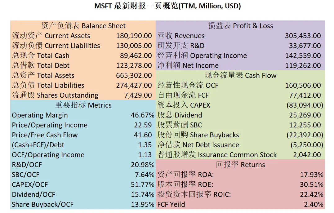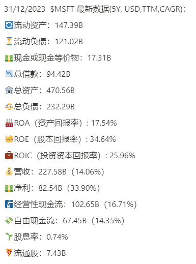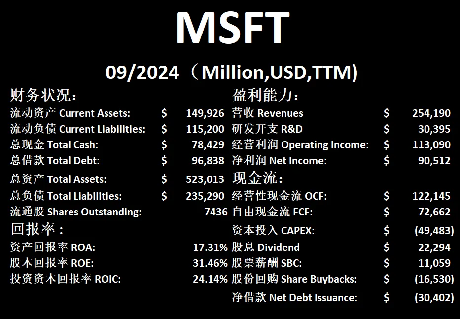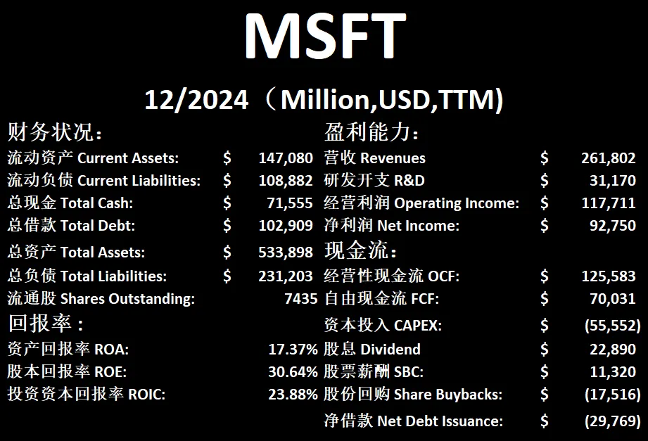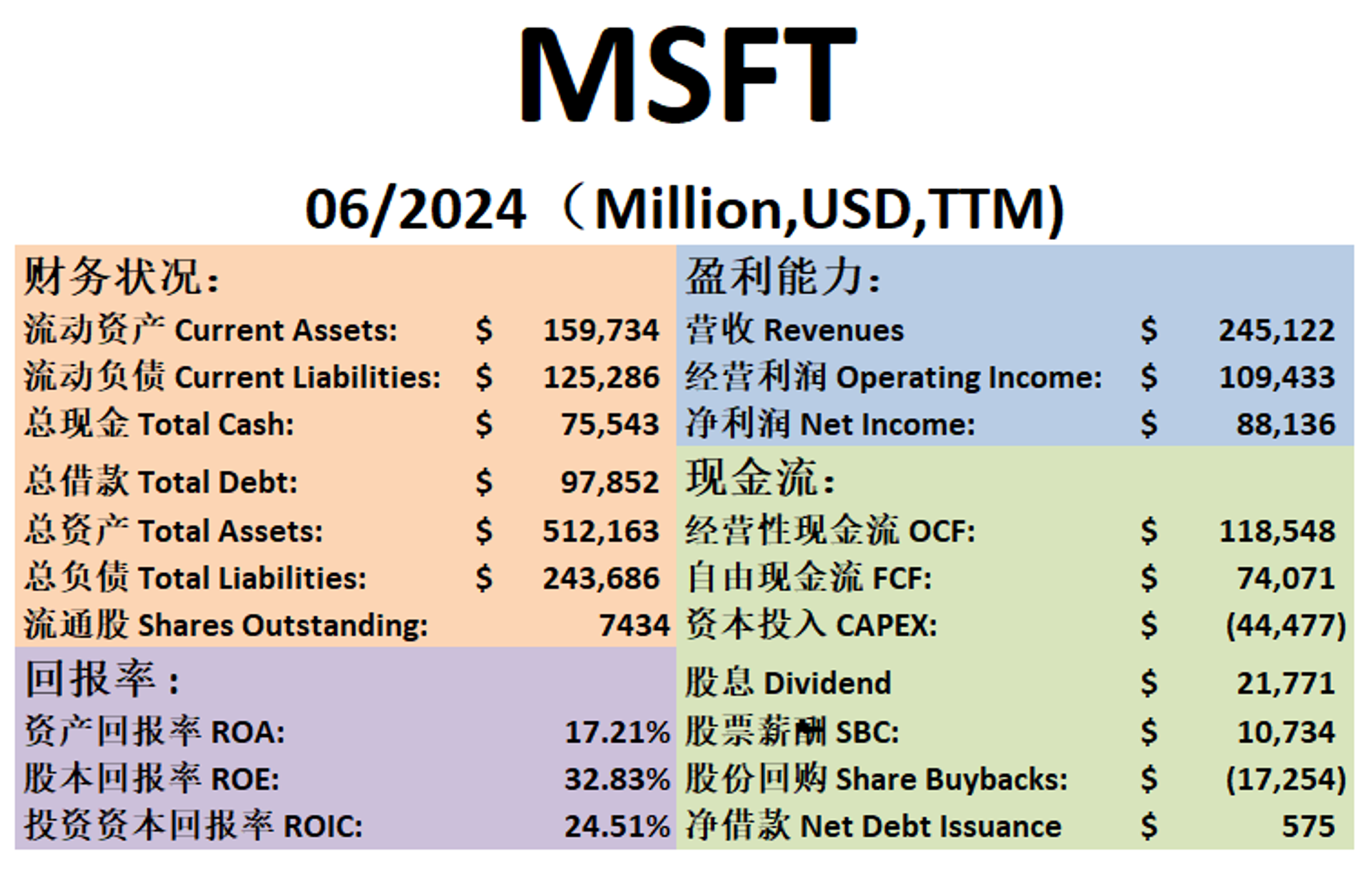 微软(Microsoft)最新面板:看看世界第一涨啥样子,财务健康,回报率优异,盈利能力增长迅速,和想象的几乎没差别