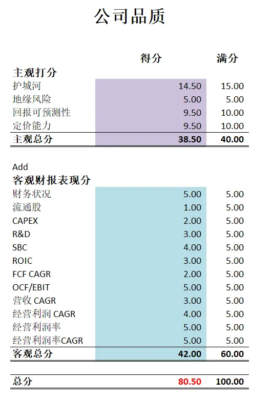 -公司品质分为80.50分。妥妥一家复利机器的打分。