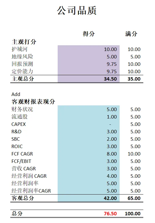 -公司品质分较上个季度涨了1分。目前可以打到77.50分。总体来说,公司表现不错,除开SBC CAPEX和流通股上扣分比较多,其他项目上公司表现非常稳定。