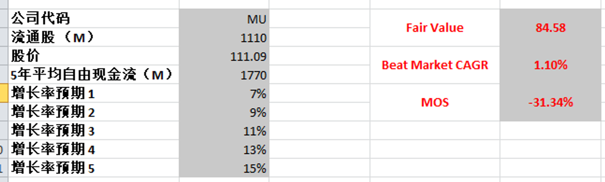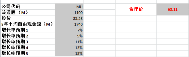 最新FCF是-1.38B,不过5年平均值大概有1.5B,管理层在会议中预期未来DRAM和NAN的增长将会在15%左右,我这边给一个比较保守的增长预期,最高15%,最低7%,合理价算出来为96.14