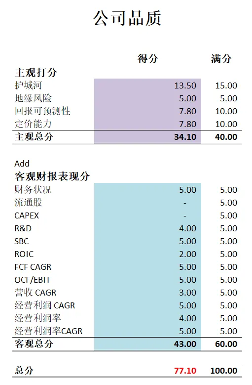 -最新公司品质为77.10分。除开流通股和CAPEX以外,其他客观分表现现在是越来越好了。