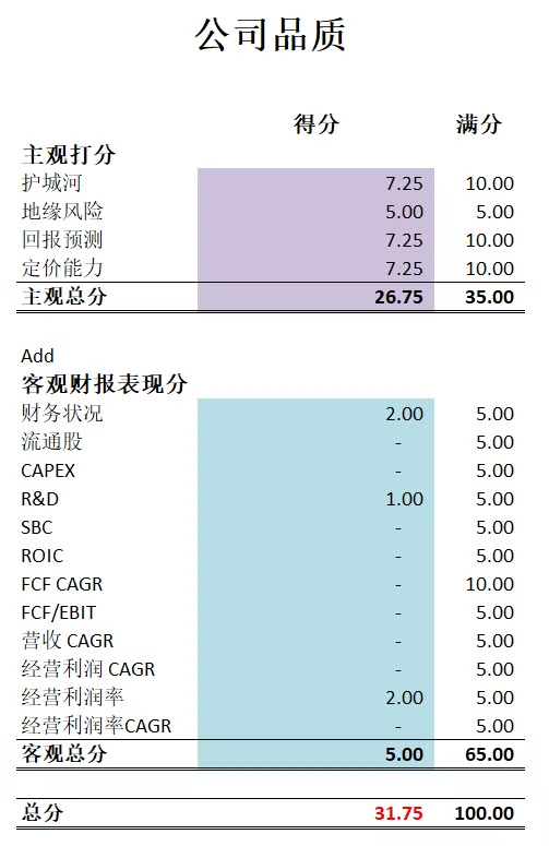 -根据我现在的打分体系,Micron得分非常低,只有31.75分。因为很多我现在特别关注的点上,Micron都是0分。