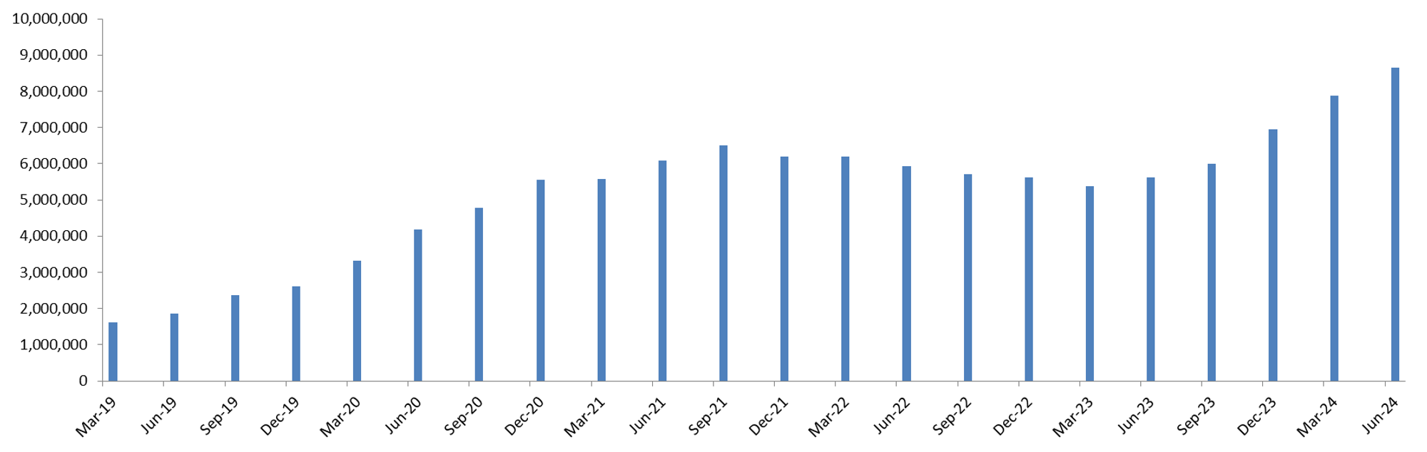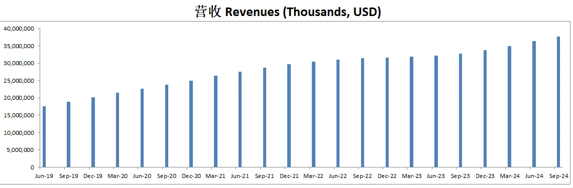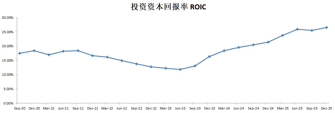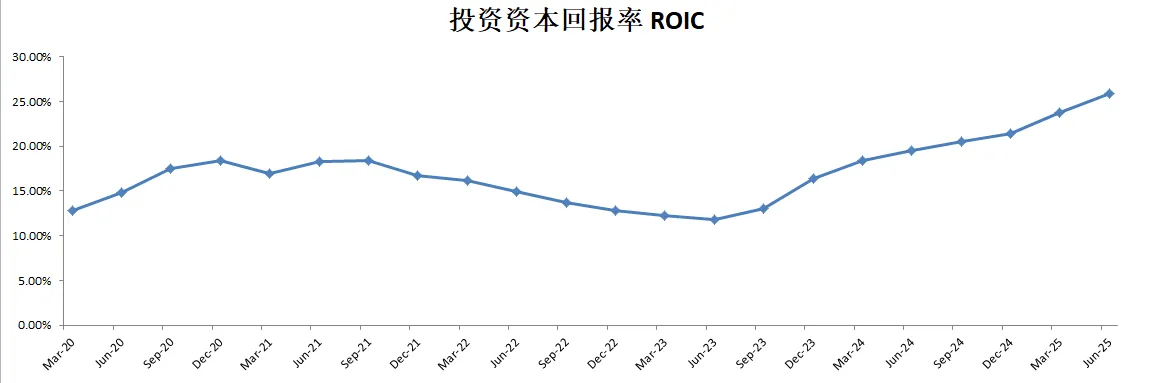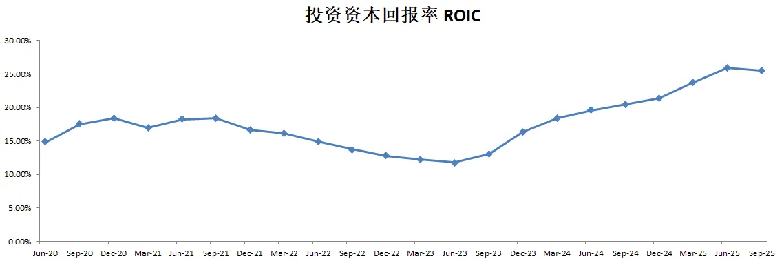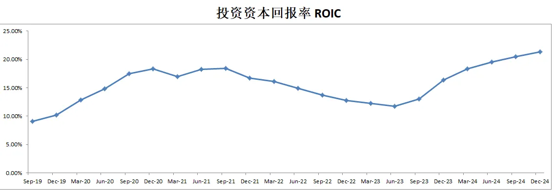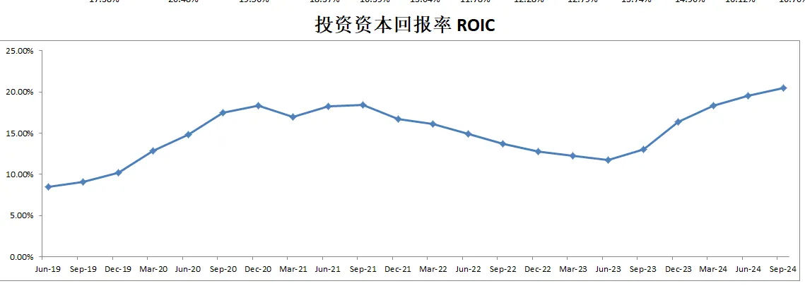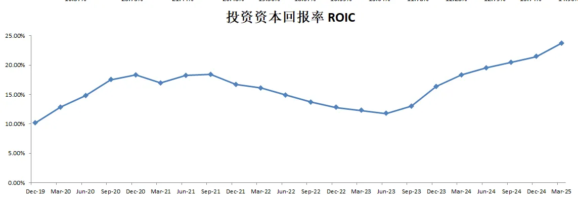 回报率相较于上个季度都有所增长,最新ROIC已经来到了24.53%,5年CAGR有7.37%