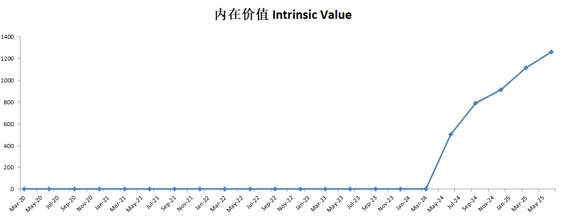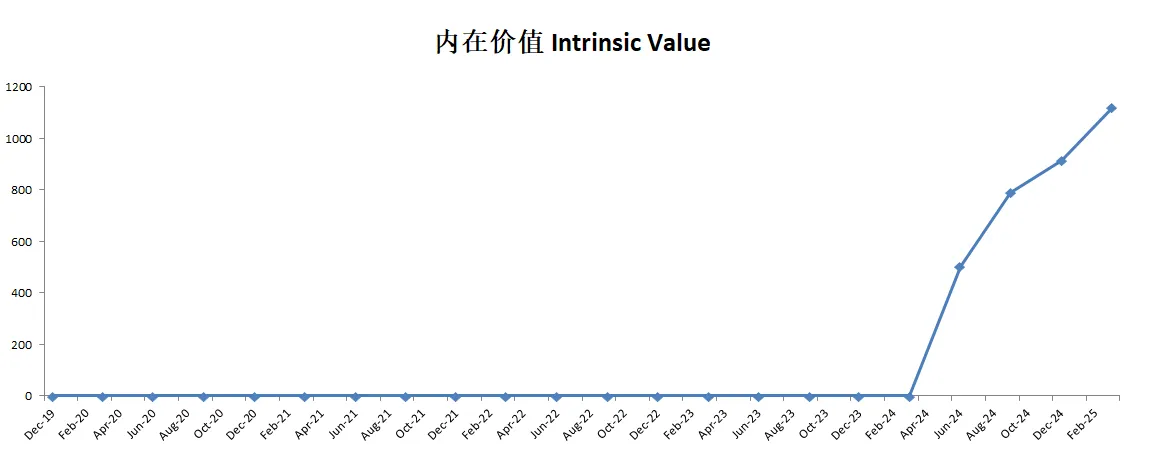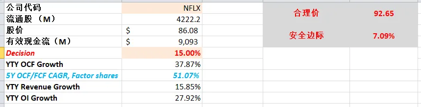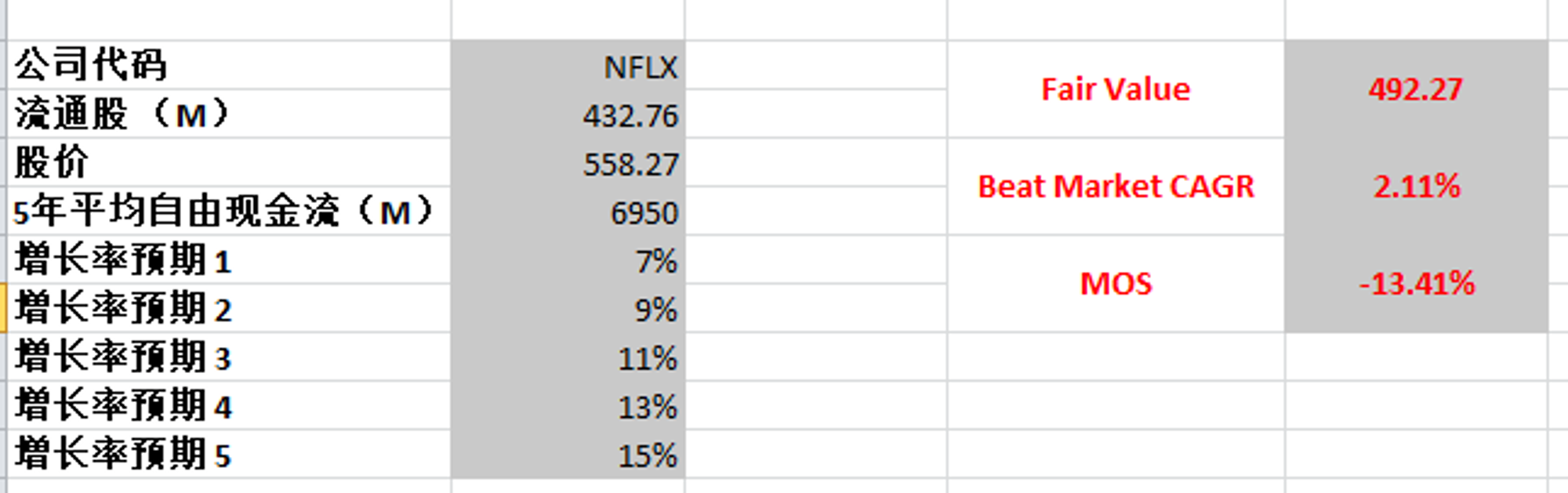 -公司目前有效现金流为7.18B。按照CAGR 15%来计算(5年CAGR 56.12%)合理价为1115.91。不得不提到的是,Netflix内在价值的增长速度实在是很惊人。每个季度合理价都在不断增长。这里是值得肯定的。