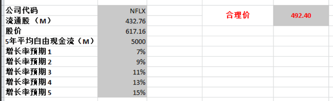使用最新FCF6.95B,最高一档用15%,合理价为492.27