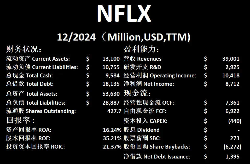 -会员增长和 ARPU(每用户平均收入)是 2025 年收入的关键驱动因素。Netflix 预计明年收入为 430 亿至 440 亿美元,这一增长由会员增长、ARPU 增加和广告推动。公司将继续专注于盈利增长,重新投资于其业务,同时在资本分配方面保持灵活性,包括股票回购。