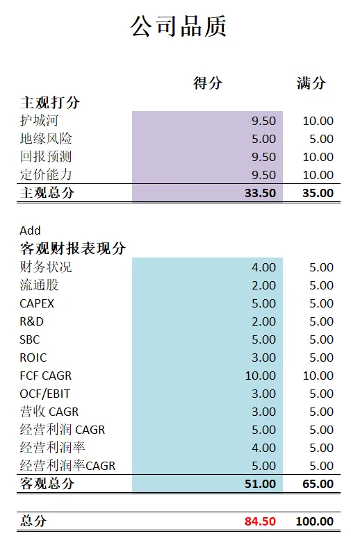-最新公司品质分为80分。这是复利机器的打分。公司主观分我也是慢慢约给越高了。客观分目前来看表现优秀,挑不出毛病。