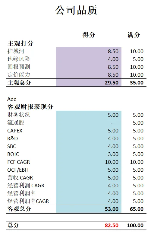 -公司目前仍然可以打到82.50分。分数仍然非常高。除开公司一直以来有少量增发之外,没有任何短板,甚至可以说,各方面表现优异。