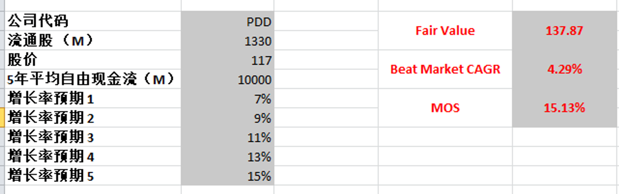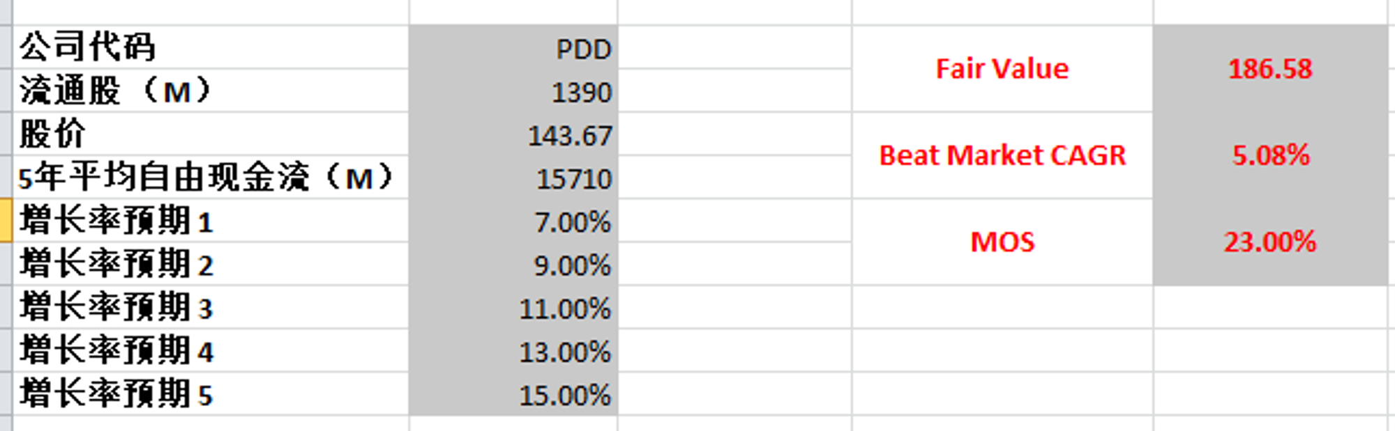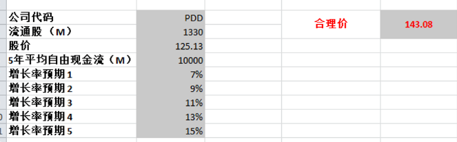 根据我的估值,我认为我给的已经很保守了,目前拼多多的FCF增长率有69.14%,我最高才给了15%,即便如此合理价算出来为186.58,目前拼多多的股价有23%的安全边际