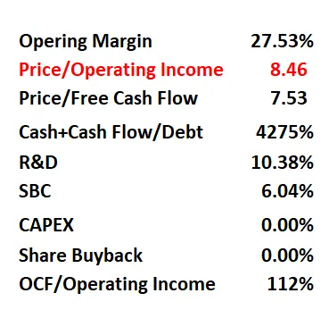 拼多多财务健康,手里有巨额现金。ROIC表现亮眼,已经来到了37.06%。营收和经营利润都刷新新高,并且增长迅速。公司善于创造现金流,FCF刷新新高,同样增长迅速。公司SBC派发并不大。拼多多既不派息也不回购股份。最让我感到神奇的地方就是拼多多没有CAPEX,不需要任何资本投入能保持如此大的增长,实在是令人咋舌