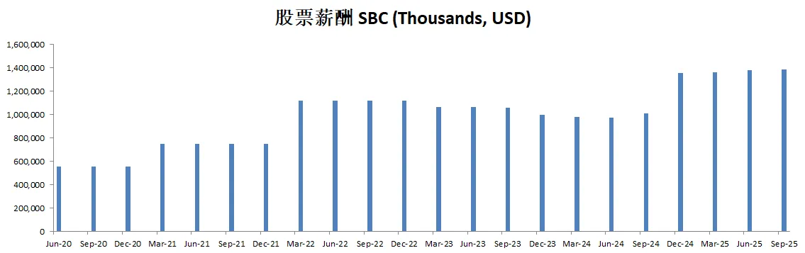 SBC最新为976.14M,5年来CAGR有28.98%,占FCF比例为6.21%,比重不大