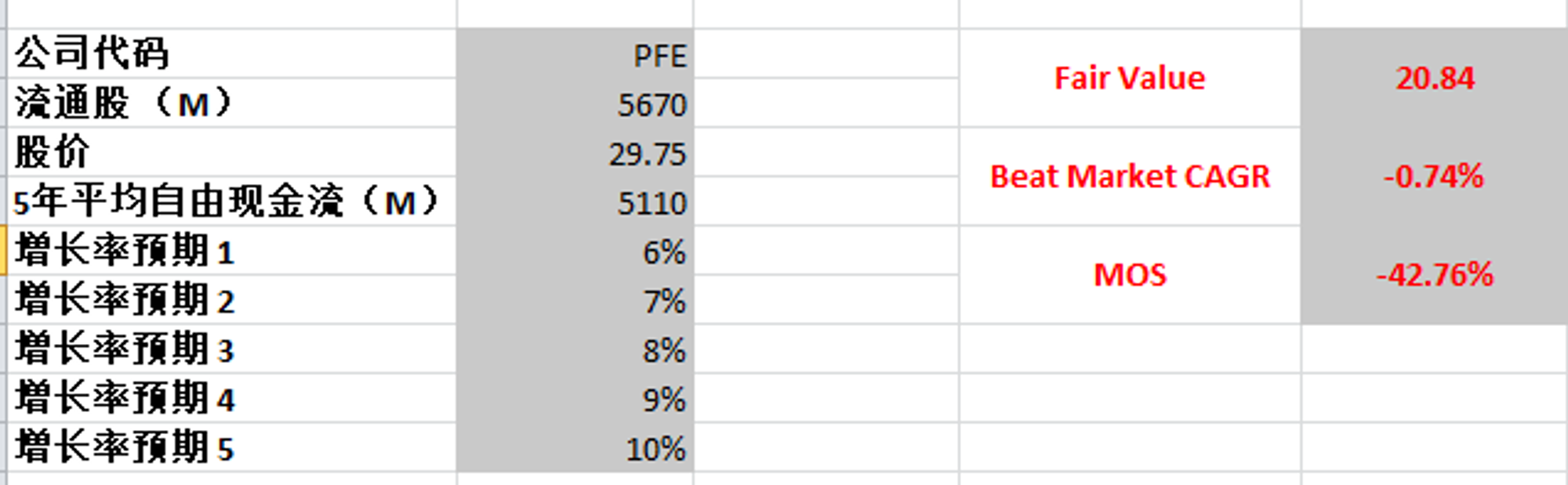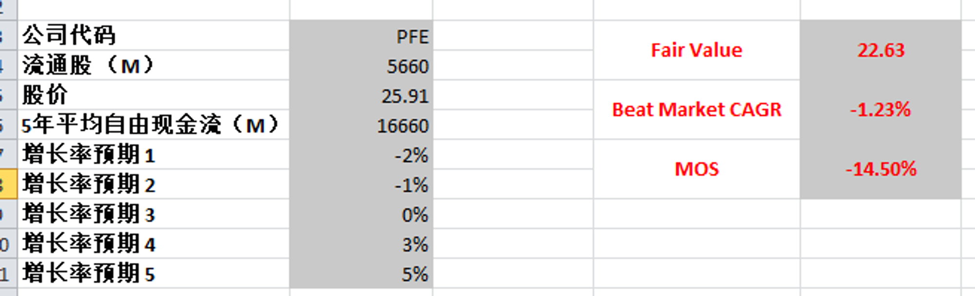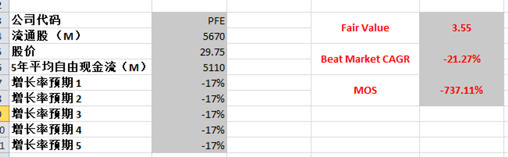 最新FCF为5.11B,5年CAGR为-17.66%,如果套入这套数据,合理价为3.55,显然太悲观了,因为辉瑞旗下有很多专利,很多常青树药品,仍然是持续提供营收的,并且跌到一定的程度,可能把PFE直接清算价值也比市值高
