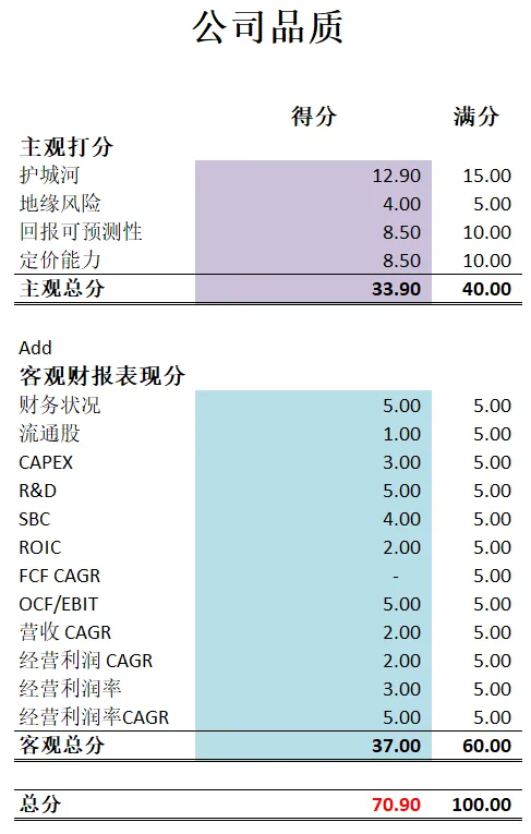 -最新公司品质分可以打到76.50分。护城河,定价能力,回报可预测性,我给得都很高。我认为腾讯这家公司属于我能力圈中心的公司。很好预测。客观分表现也很出色。