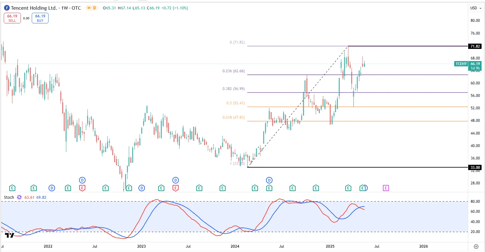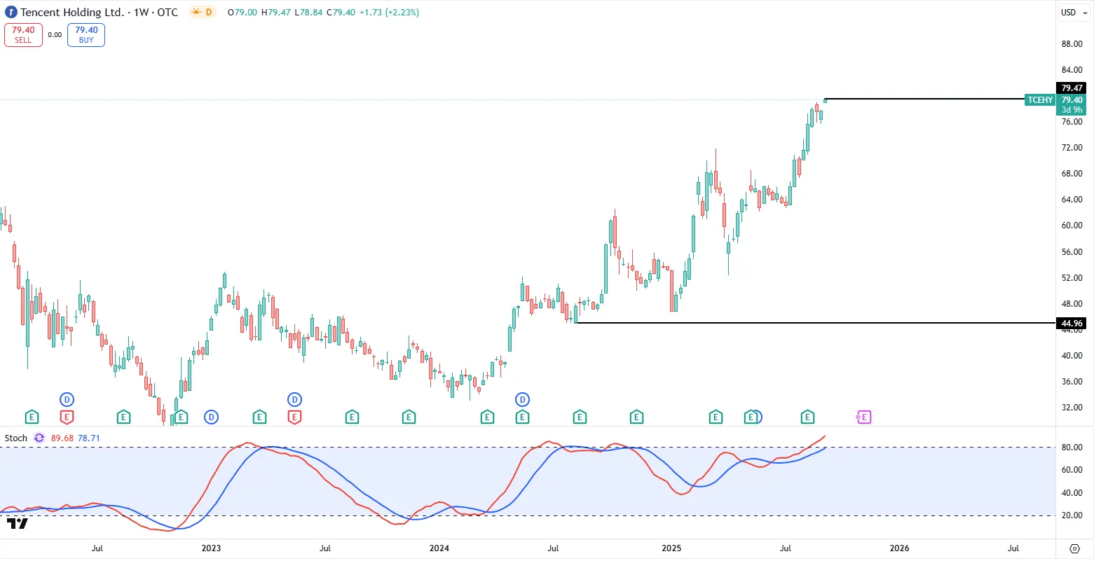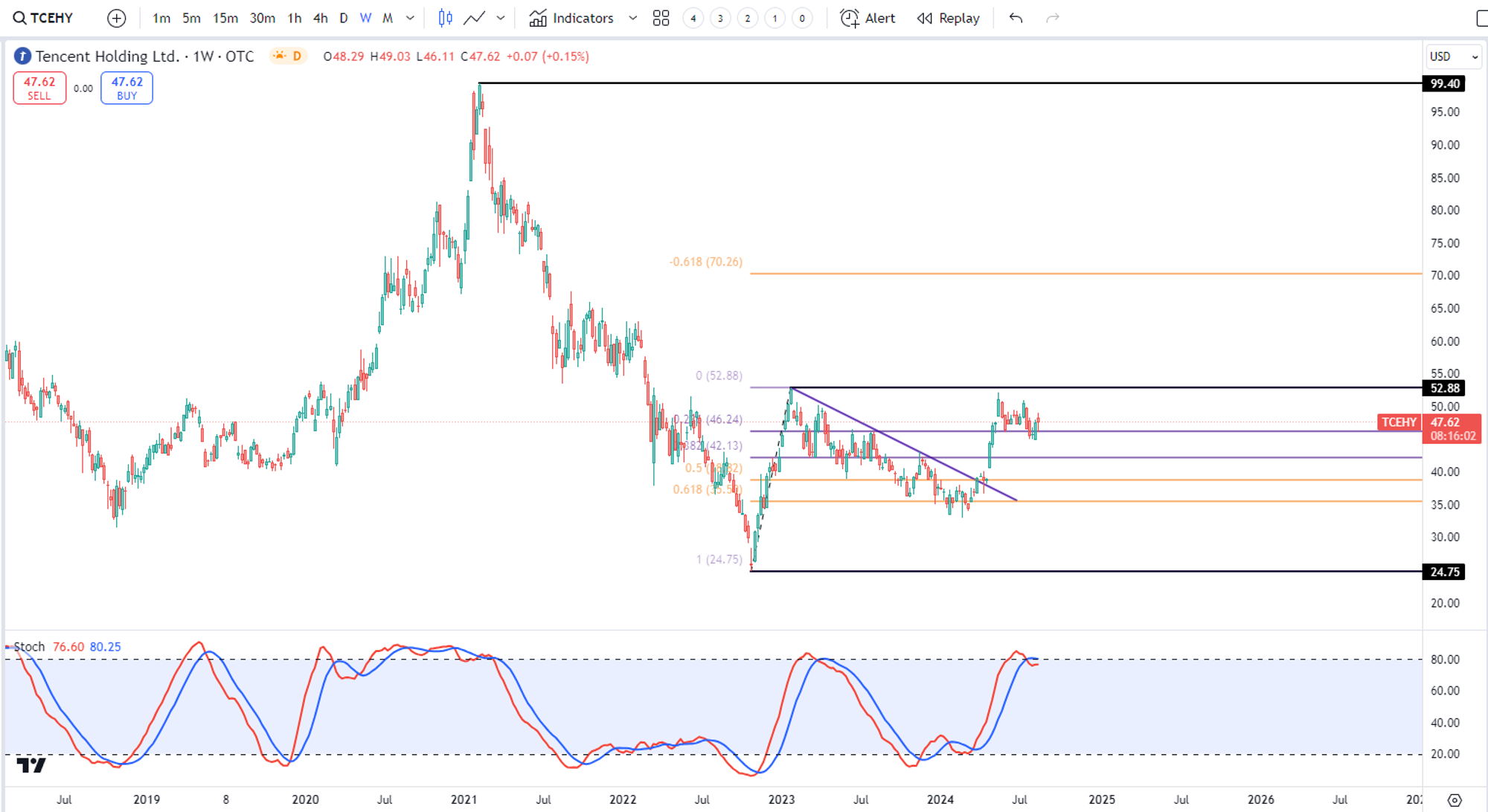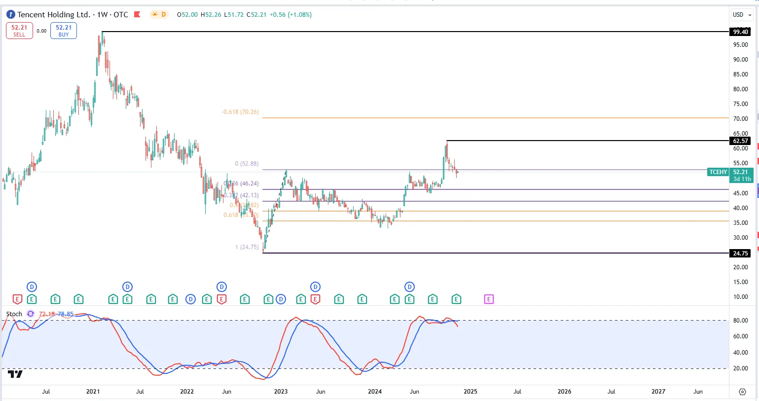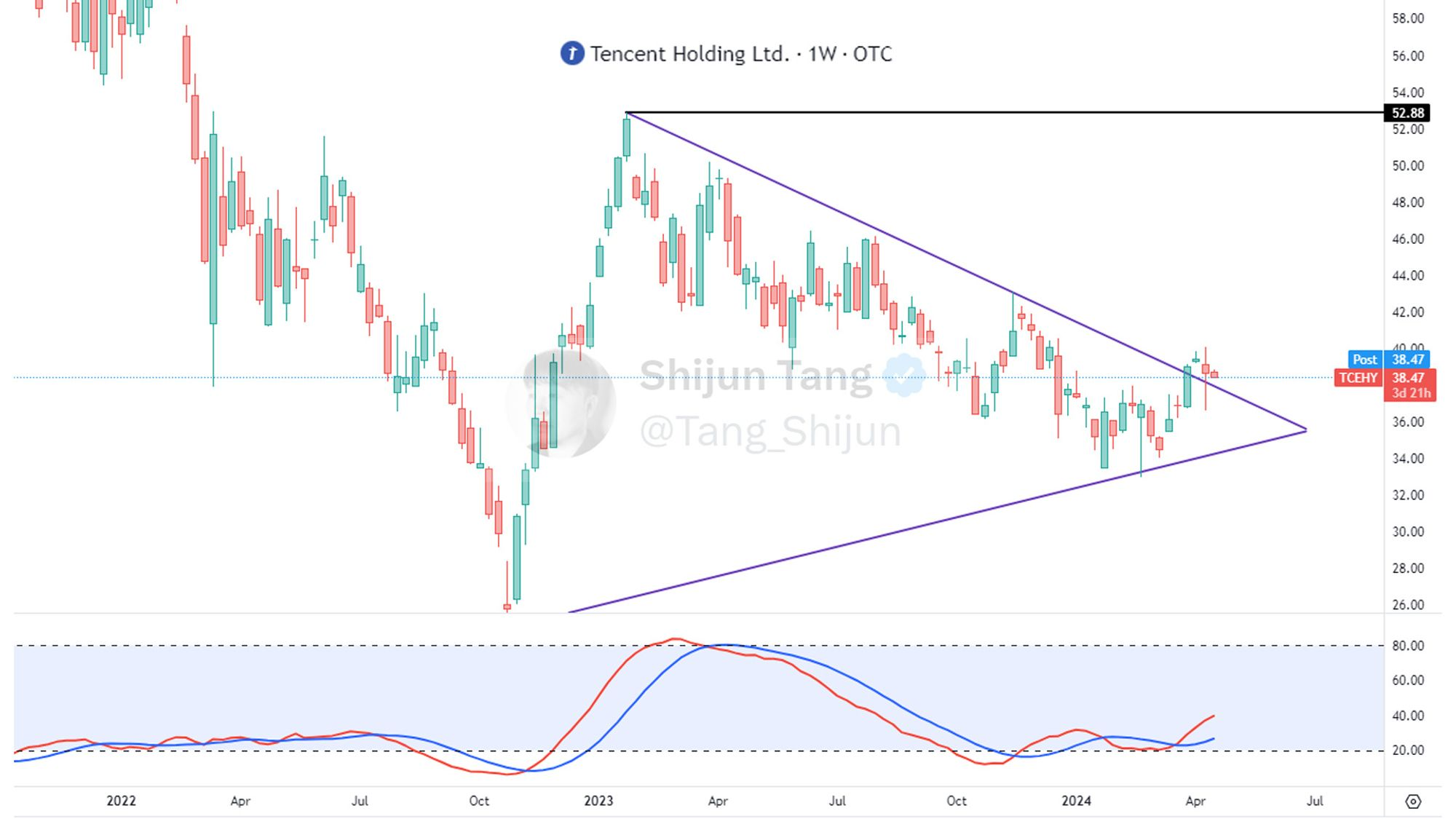 腾讯 ( $TCEHY )自从22年10月触底$24.75之后,目前一度涨了113.66%,翻了2.14倍。