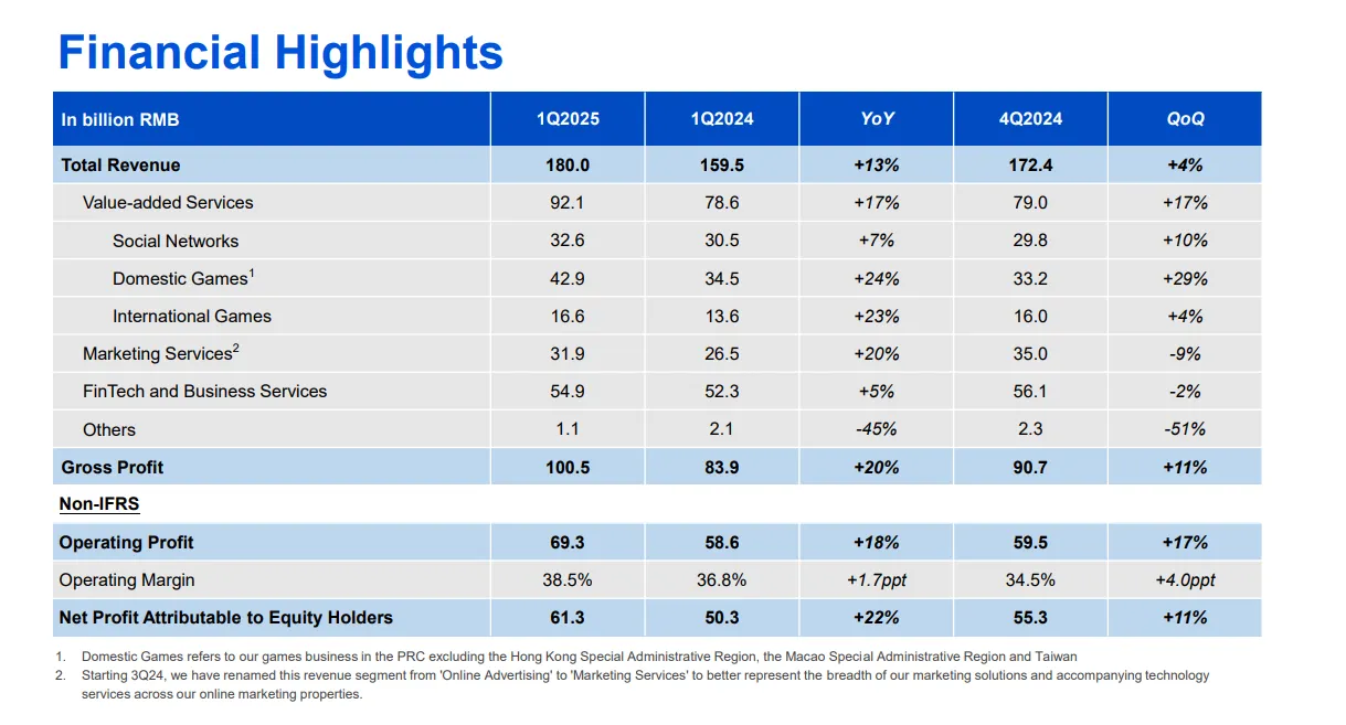 -增值服务(VAS):收入:人民币830亿元(同比+9%)国内游戏:人民币370亿元(同比+14%),由《王者荣耀》《和平精英》《VALORANT》和《地下城与勇士手游》驱动。国际游戏:人民币150亿元(同比+9%),主要由《PUBG Mobile》和《荒野乱斗》推动。