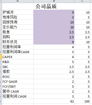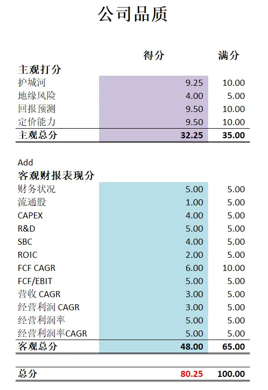 -公司品质有80.25分,作为中概股,能打到80分以上,实属不易。并且公司几乎没有短板。唯一挑刺就是股份回购的速度并不快,不过最新财报会议中管理层似乎开始注重这一问题了。