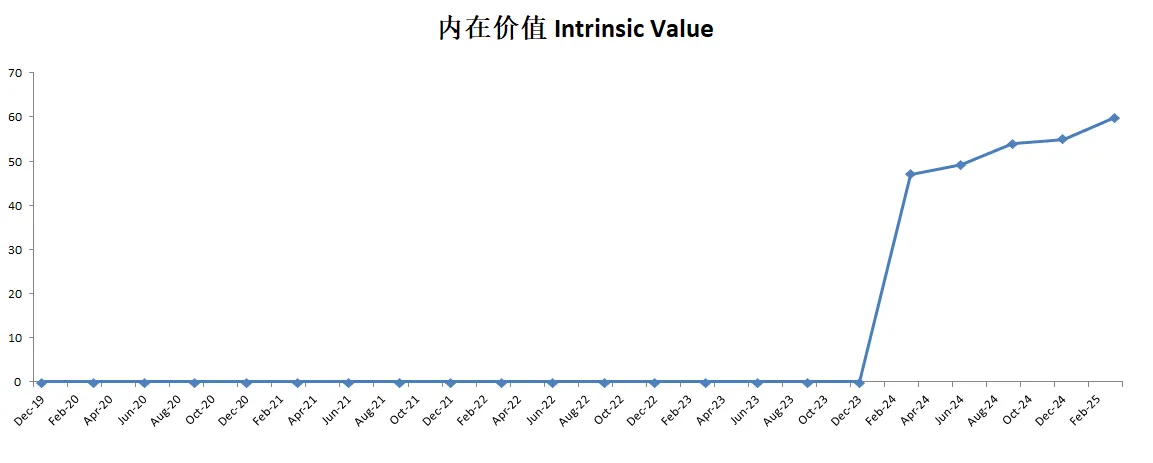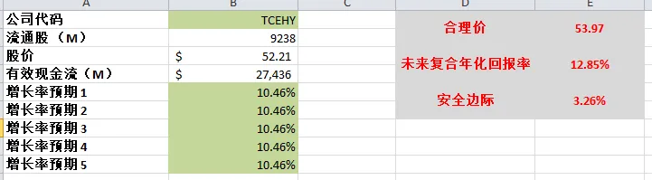 -腾讯最新有效现金流有23.53B,如果按照CAGR10.72%(5年CAGR 10.72%)来算的话,合理价为59.96。虽然不多,但是腾讯的内在价值每个季度都在慢慢上涨。
