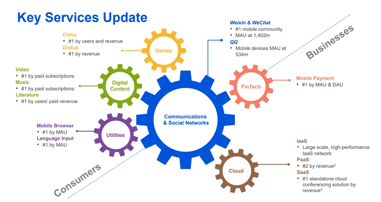 -腾讯在所处各个行业中,均处在中国第一的位置。