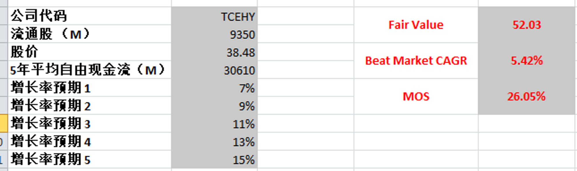 我用最新FCF 30.61B,最高一档用了15%,5年FCF CAGR可是有28.31%超过我的预期2倍,所以我认为还是很保守的,这么算腾讯有26.05%的MOS,Beat market 5.42%