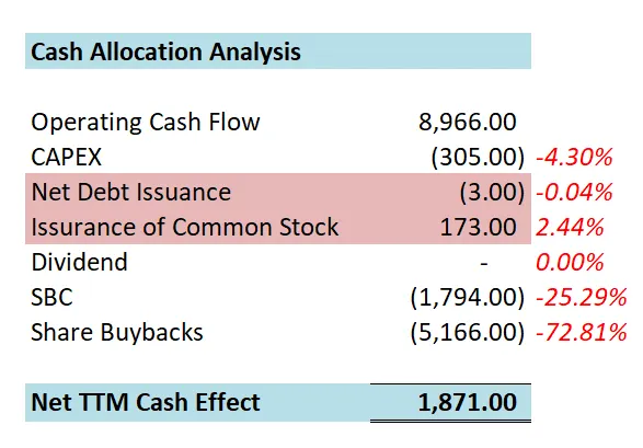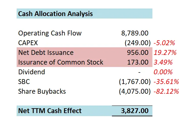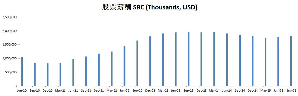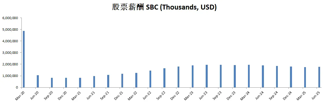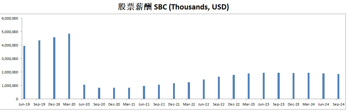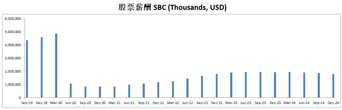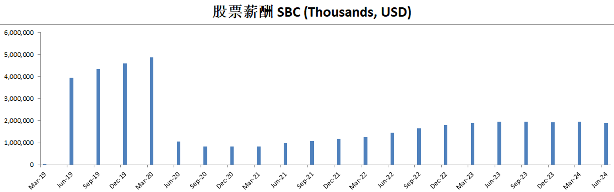 -最新SBC来到了1.95B,5年来CAGR有181.63%,管理层虽然创造了不错的业绩,但是在我看来,他们SBC开太多了,目前已经差不多占了FCF的一半,比较 $ABNB 同样是媒介行业巨头,但是ABNB SBC也才占FCF 1/3左右