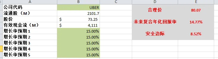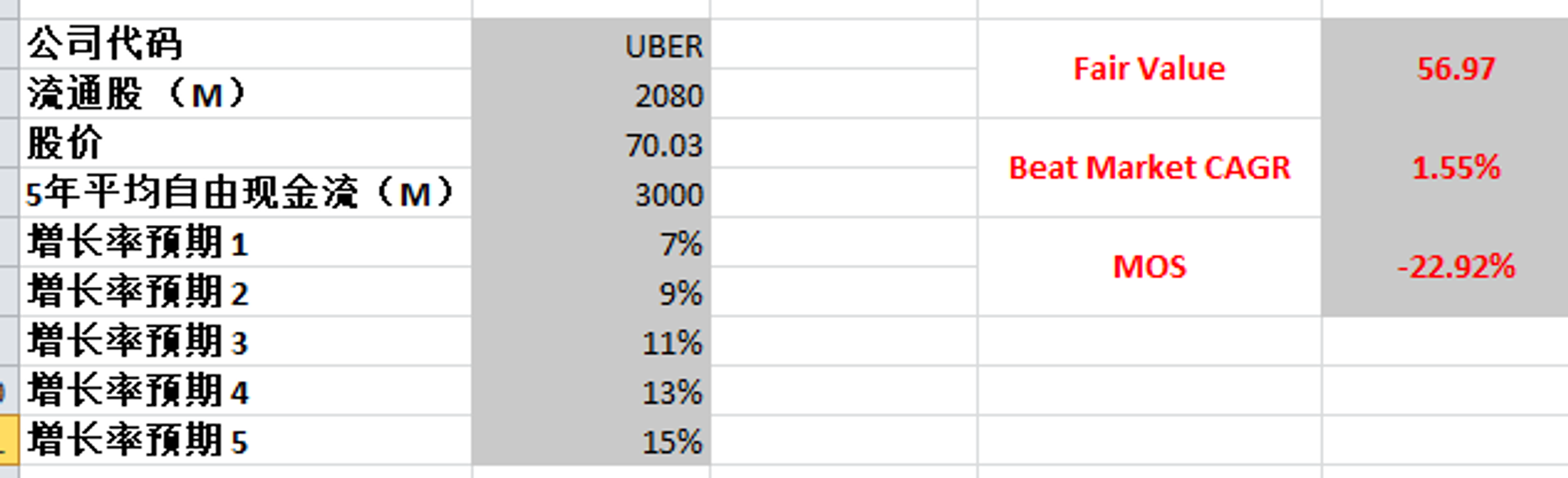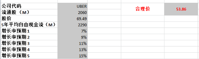 目前最新FCF是4.17B,即便我使用最新FCF,给Uber最高一档15%的CAGR,合理价也就59.12