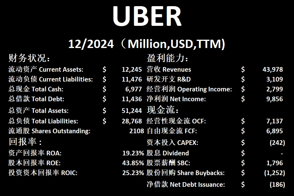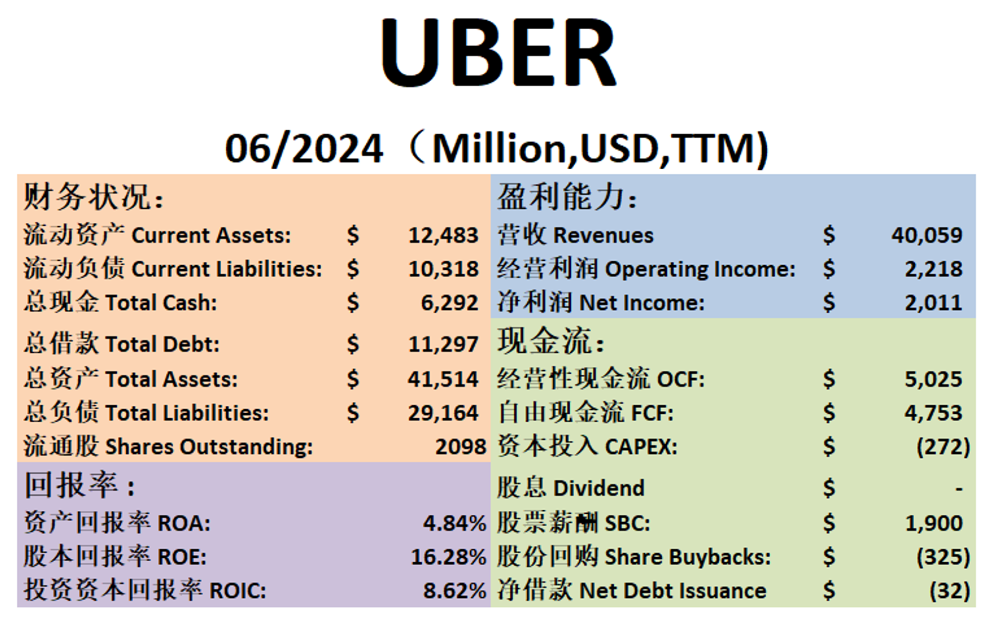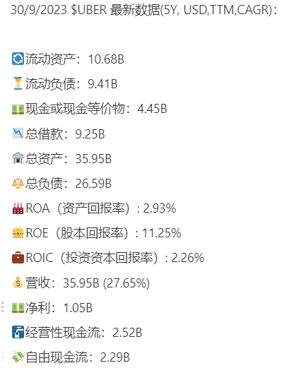 Uber自从22年以内,开始盈利了。目前财务健康,回报率任然堪忧,但是营收增长很快,公司开始报告正向净利