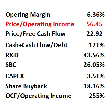 -公司品质分可以打到73.5分,分数很高了。短板很明显,流通股一直在增发,R&D投入恐怖,SBC派发很高,ROIC表现很一般。公司优点也很明显,盈利能力增长显著,基本上都是满分。
