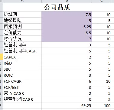 -公司品质不错,有接近70分。主要扣分是在CAPEX,和盈利能力增长上。再就是我的自己主观上会有不确定性的扣分。