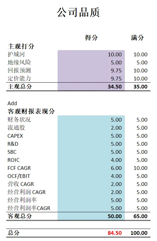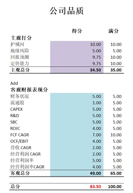 -公司最新品质分为81.50。主观分我给的分和MA一模一样。我认为他们两都属于全球第一梯队护城河和定价能力。客观分得分也很高,除开流通股回购速度上只能得到1分之外,其他表现几乎完美。