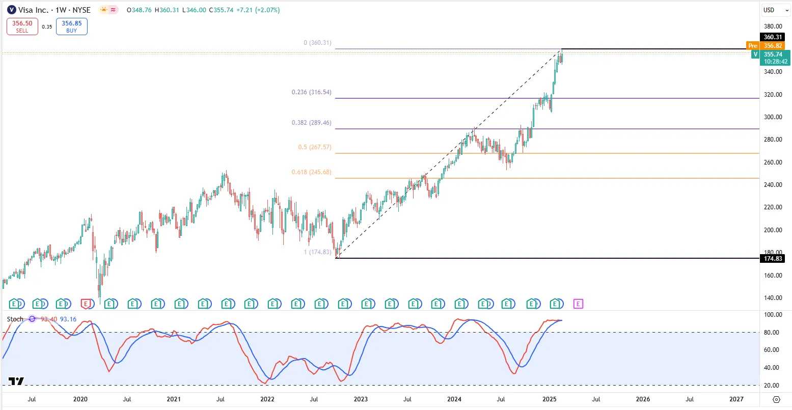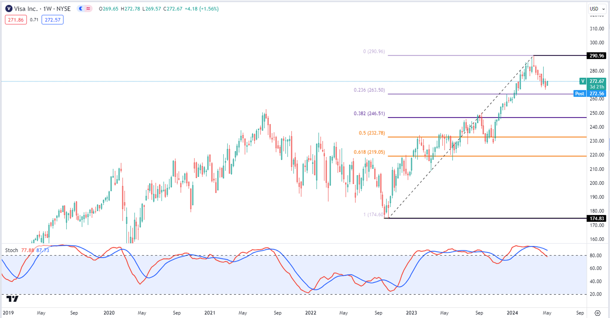 技术面来看,Visa在随机指标超买区域已经480多天了