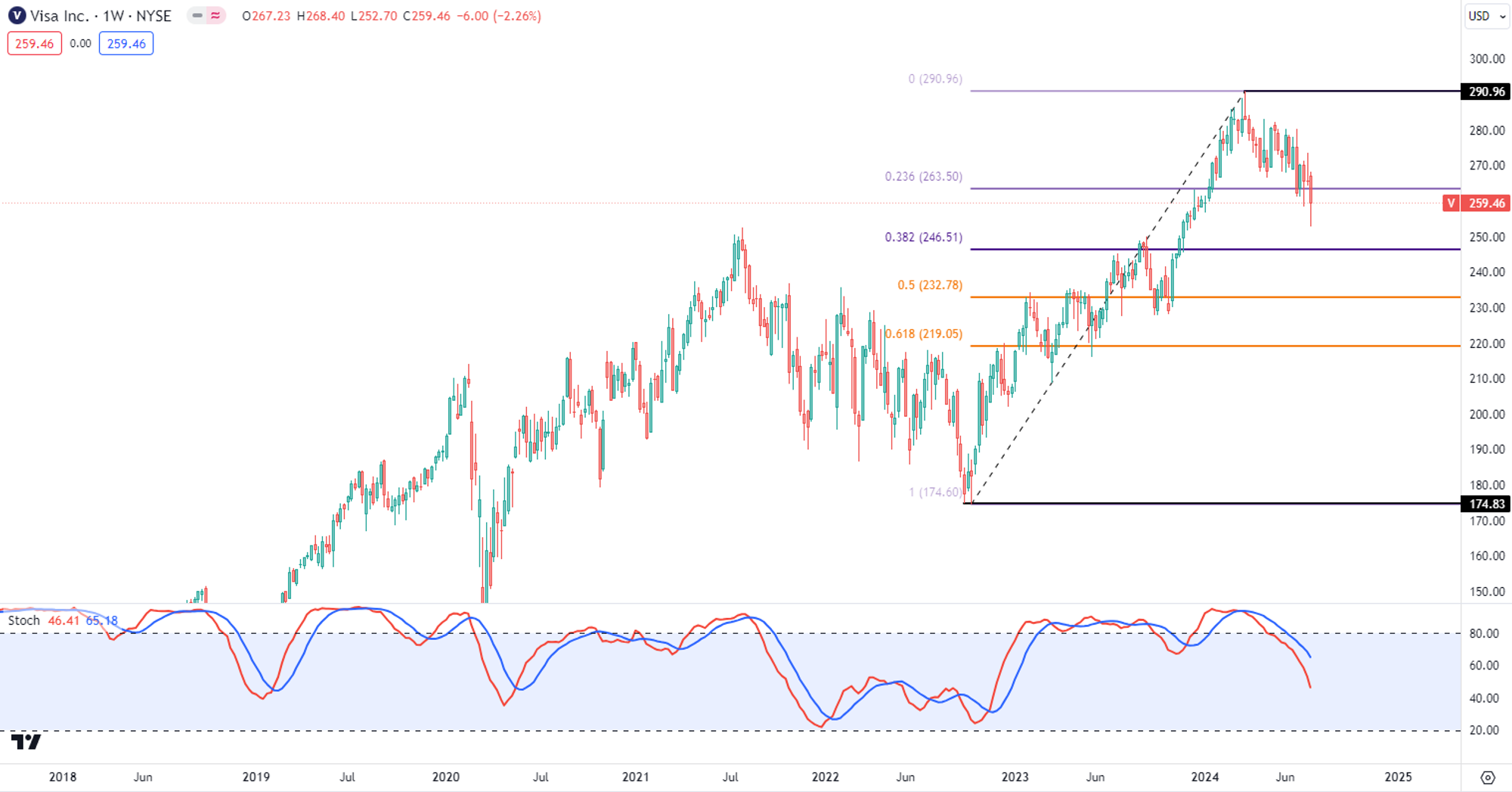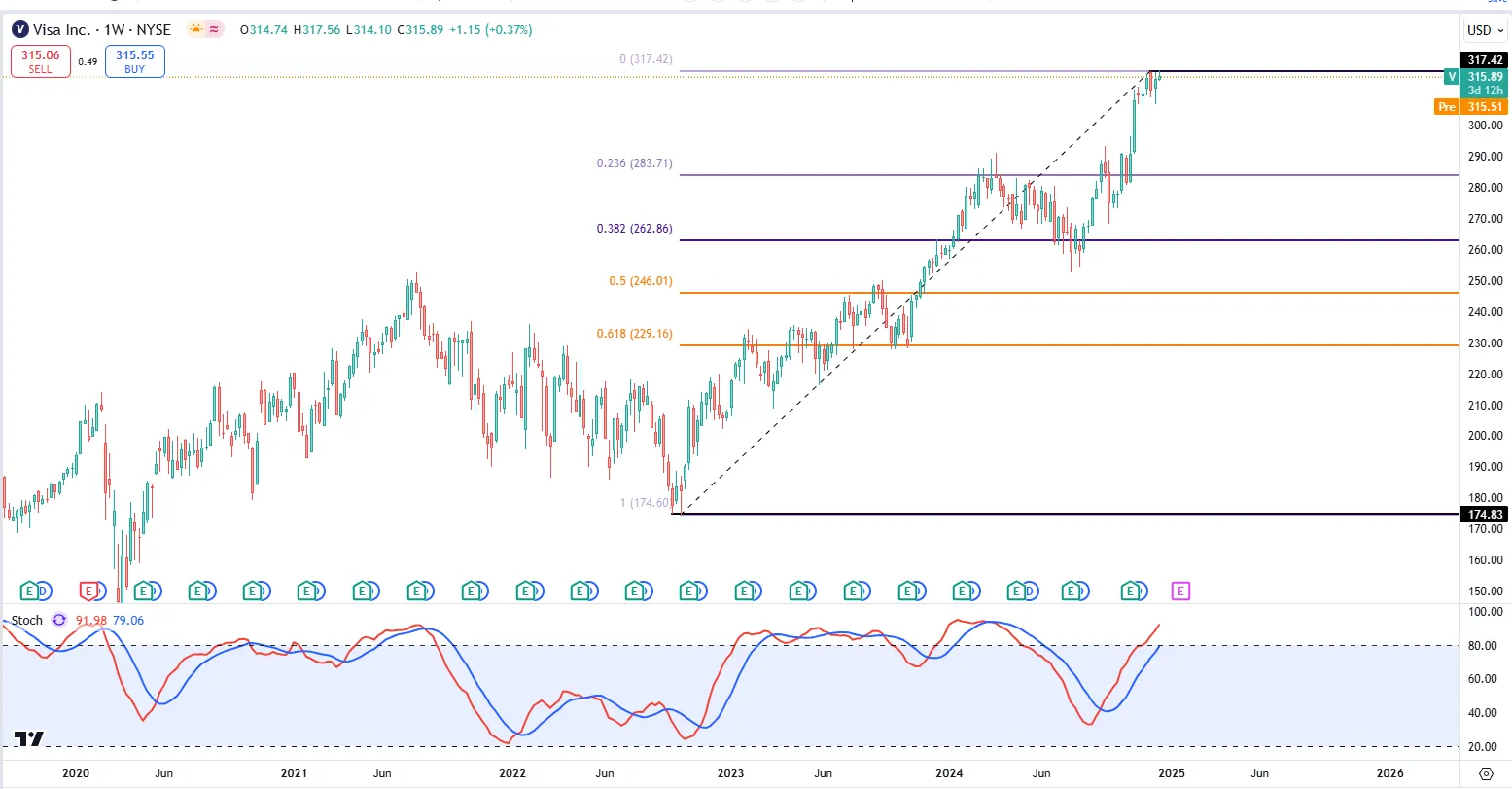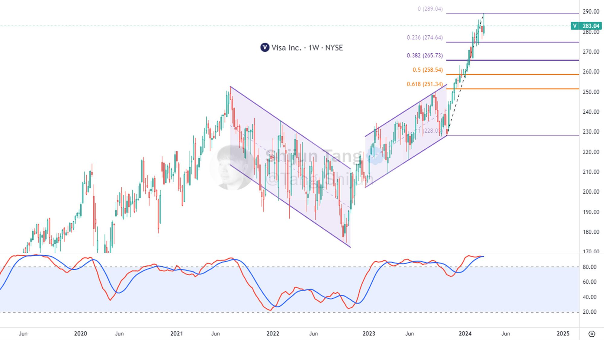 -Visa股价走势很稳,目前股价再次调整,尝试挑战历史前高。