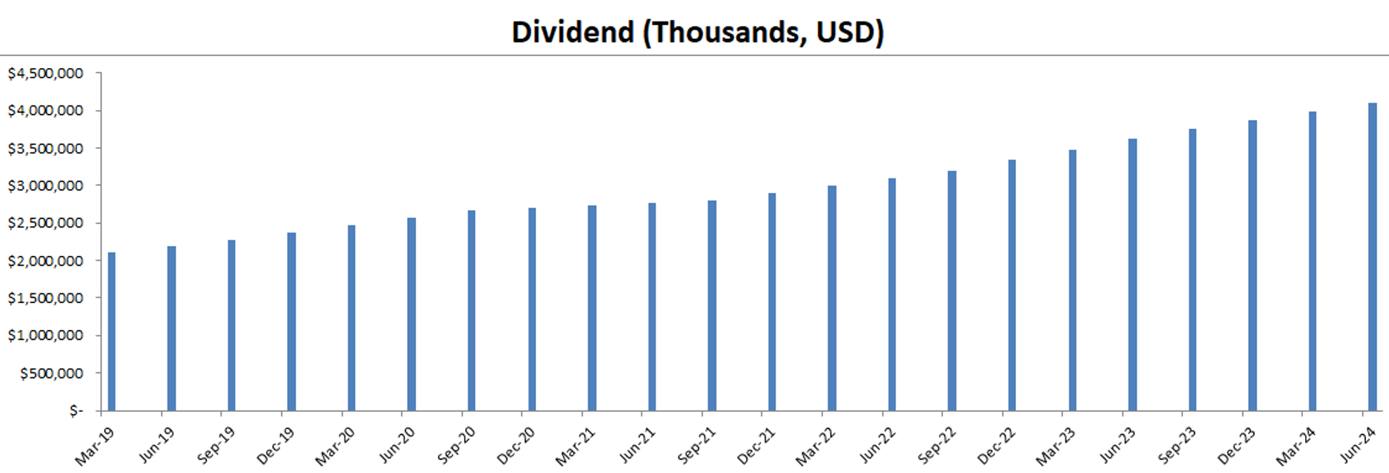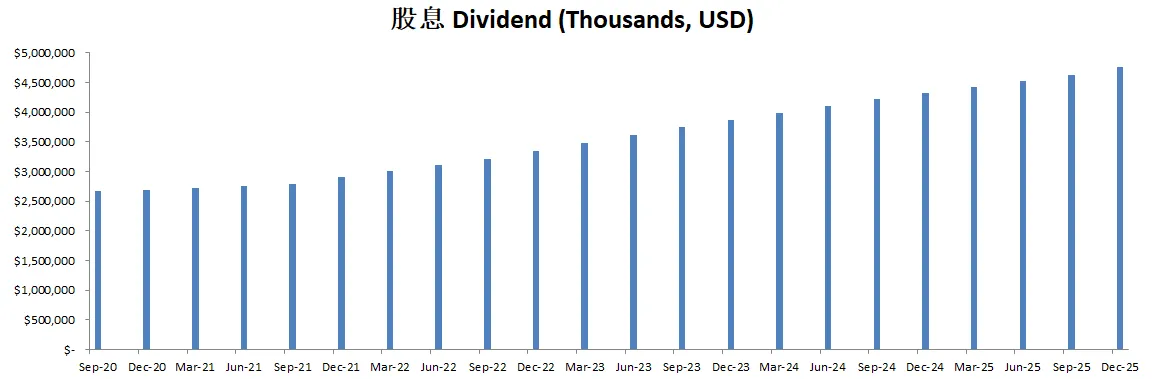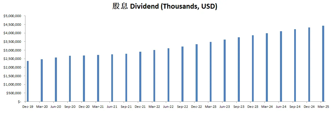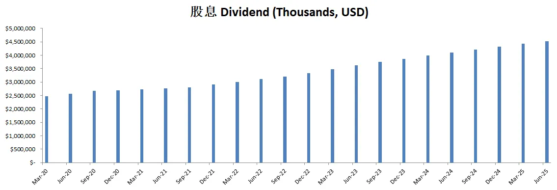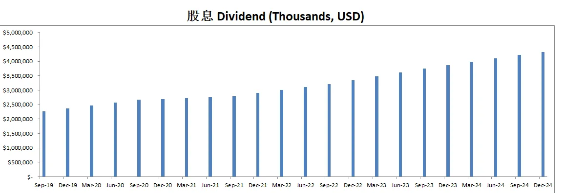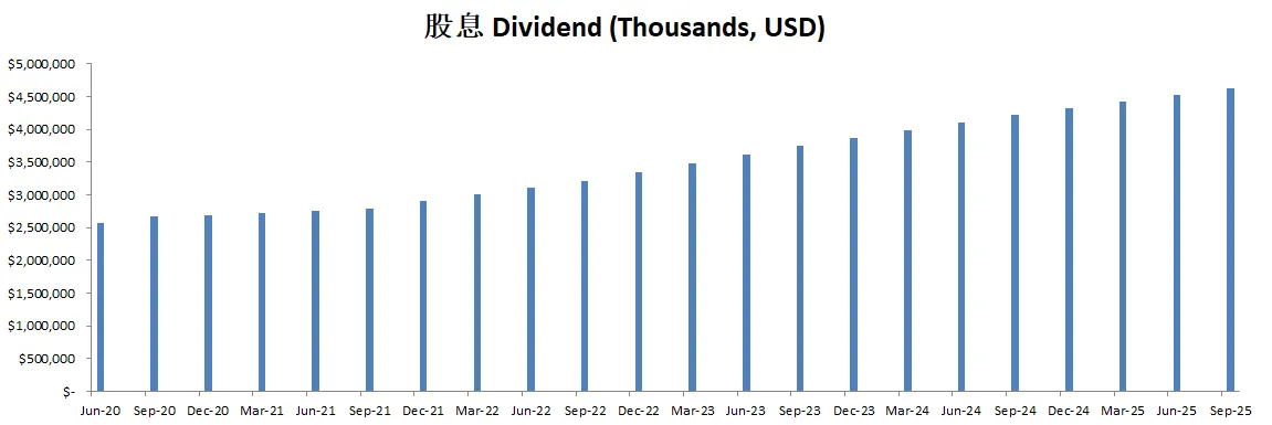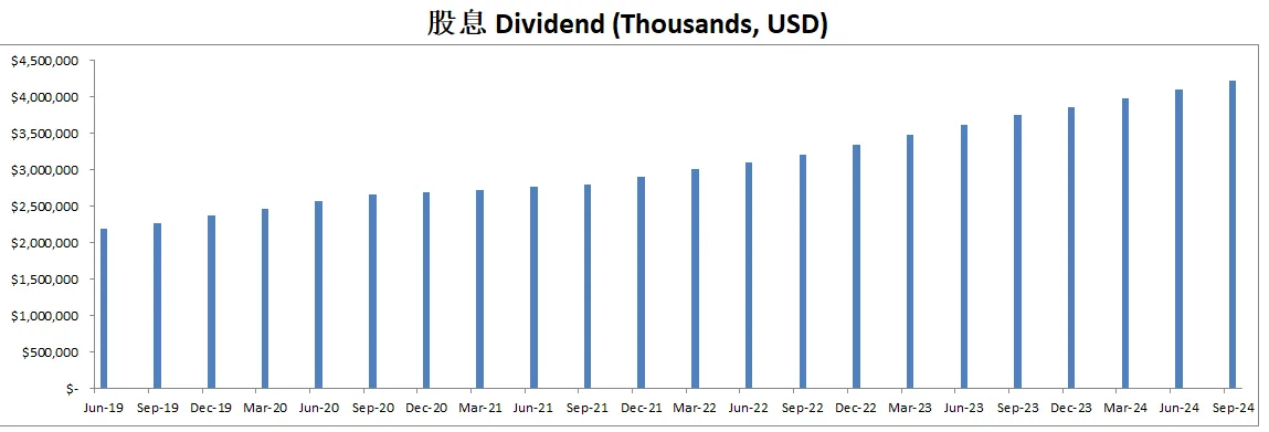 最新面板来看,资产负债表强劲,财务非常健康,回报率亮眼,ROIC有39.15%,盈利能力增长很稳定,基本上CAGR在10%左右,股息稳定增长